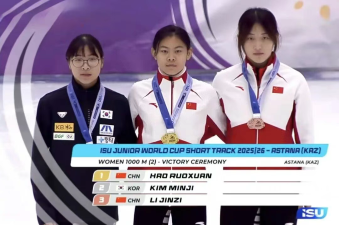 北京时间11月10日,短道速滑青年世界杯哈萨克斯坦站比赛全部结束,中国队交出了4金4银3铜的优异成绩单。郝若萱的出色表现成为本站比赛的最大亮点。在女子1000米单项决赛中,面对两名韩国选手的夹击,她沉着冷静,在倒数第二圈时抓住机会连续从内道完成漂亮的超越,并在终点线前绝杀两名韩国选手率先冲线。